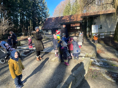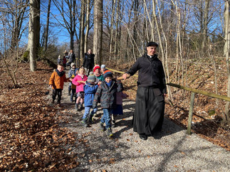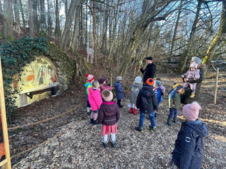 Nach der feierlichen Weihe unserer neuen Schulfahne in unserer Kirche und einem anschließenden gemütlichen Frühstück im Gemeindesaal, machte sich unser Kindergarten in Fahrgemeinschaften auf den Weg zum Kloster Bonlanden zur dortigen Krippenausstellung. Es war uns eine Freude, dass Herr Pater Hager uns begleitete und uns durch die Krippenausstellung führte. Mit viel Interesse und Aufmerksamkeit verfolgten unsere Kinder dem Erzählten. Nach einer kleinen Stärkung versammelten wir uns auf dem Außengelände des Klosters, wo wir den „Greccio - Weg“ (Wegstationen zur Krippendarstellung) folgten. Am See des Klosters angelangt, fischte Herr Pater Hager zum Erstaunen aller Kinder eine große Eisplatte aus einer bronzenen „Klangschüssel“ heraus. Nach einem kurzen Besuch an der dortigen Lourdes Grotte gelangten wir zu einem Spielplatz, wo wir alle viel Freude hatten. Dankbar und erfüllt, mit dem Fund von großen und kleineren Stöcken und Ästen, machten wir uns dann wieder auf zum Kindergarten.